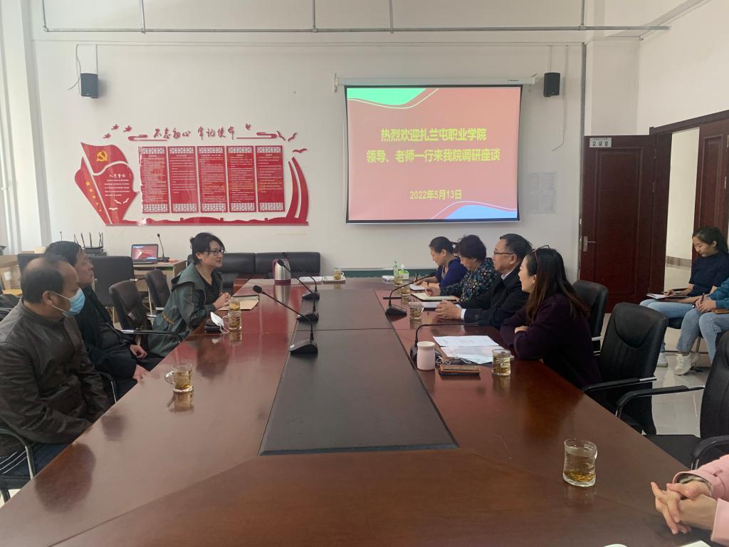 2022年5月13日,扎兰屯职业学院党委副书记任林宏,宣传部部长、马克思主义教研部主任王虹和马克思主义教研部孟凡祥一行三人来我院调研座谈,米兰官网党委副书记张国栋、米兰milan官网党总支书记刘凤琴、院长李俏、副书记刘琳、副院长吴秀芳、团学办、综合办和系部主任、课程负责人参加了座谈会。