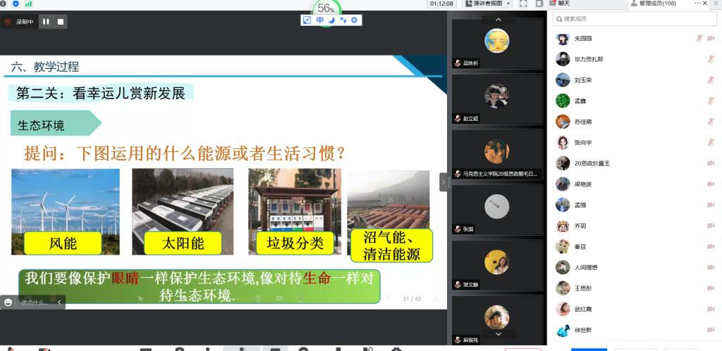 讲座中,薛瑞莹老师首先向各位同学分享了教招经验,从笔试和面试两个方面给各位师范生传授了宝贵的经验。随后薛瑞莹老师给大家进行了读本示范课展示,针对第三讲"走进新时代"从教材、学情、教学目标、教学过程、教学重难点、教学方法与手段及教学反思等几个方面进行了全面的讲解。讲座结束后,薛瑞莹老师针对教学中常见问题与学生进行了互动交流。在线的百余名学生对教招考试和日常教学中的问题、难点和疑惑向薛瑞莹老师进行了提问,教研活动在轻松愉悦的氛围中结束。